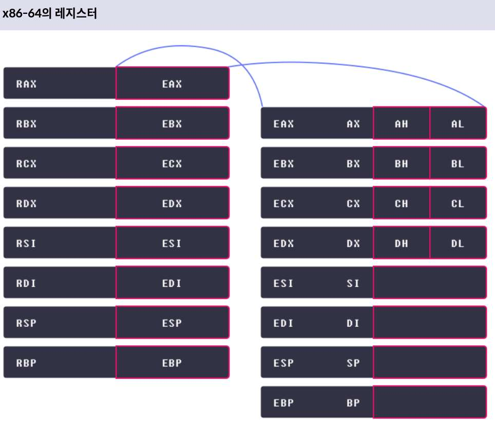 예를 들면 RAX는 EAX의 64비트 확장판이며, EAX는 다시 AX와 AX가 아닌 부분으로 나뉜다.