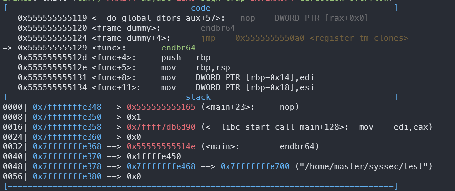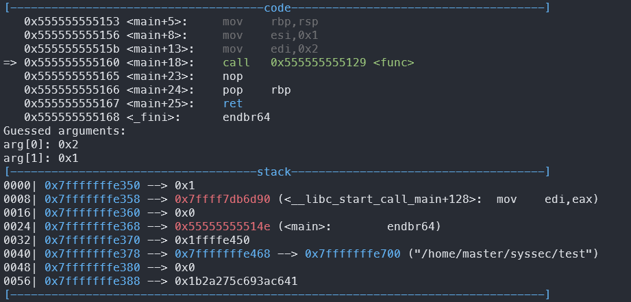 이는 리눅스 메모리 레이아웃의 함수 호출 규약에 의해 인자는 반대 순서로 저장된다는 것을 알 수 있다.
