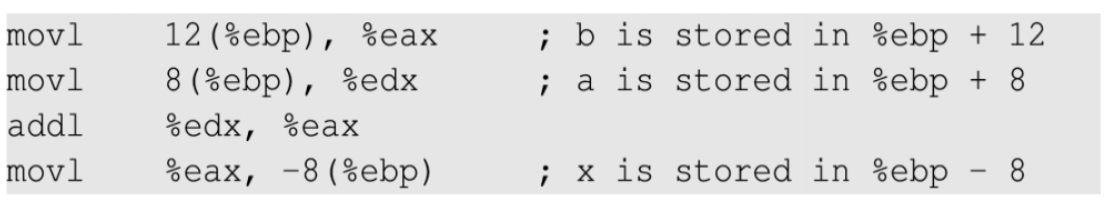 스택의 베이스 포인터 (ebp)로 부터 12 만큼 떨어진 곳에 b를 넣은 후 8 만큼 떨어진 후에 a를 넣는다.