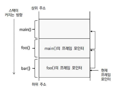 함수가 호출되면 하위 주소로 계속 함수의 스택 프레임이 생성된다.
