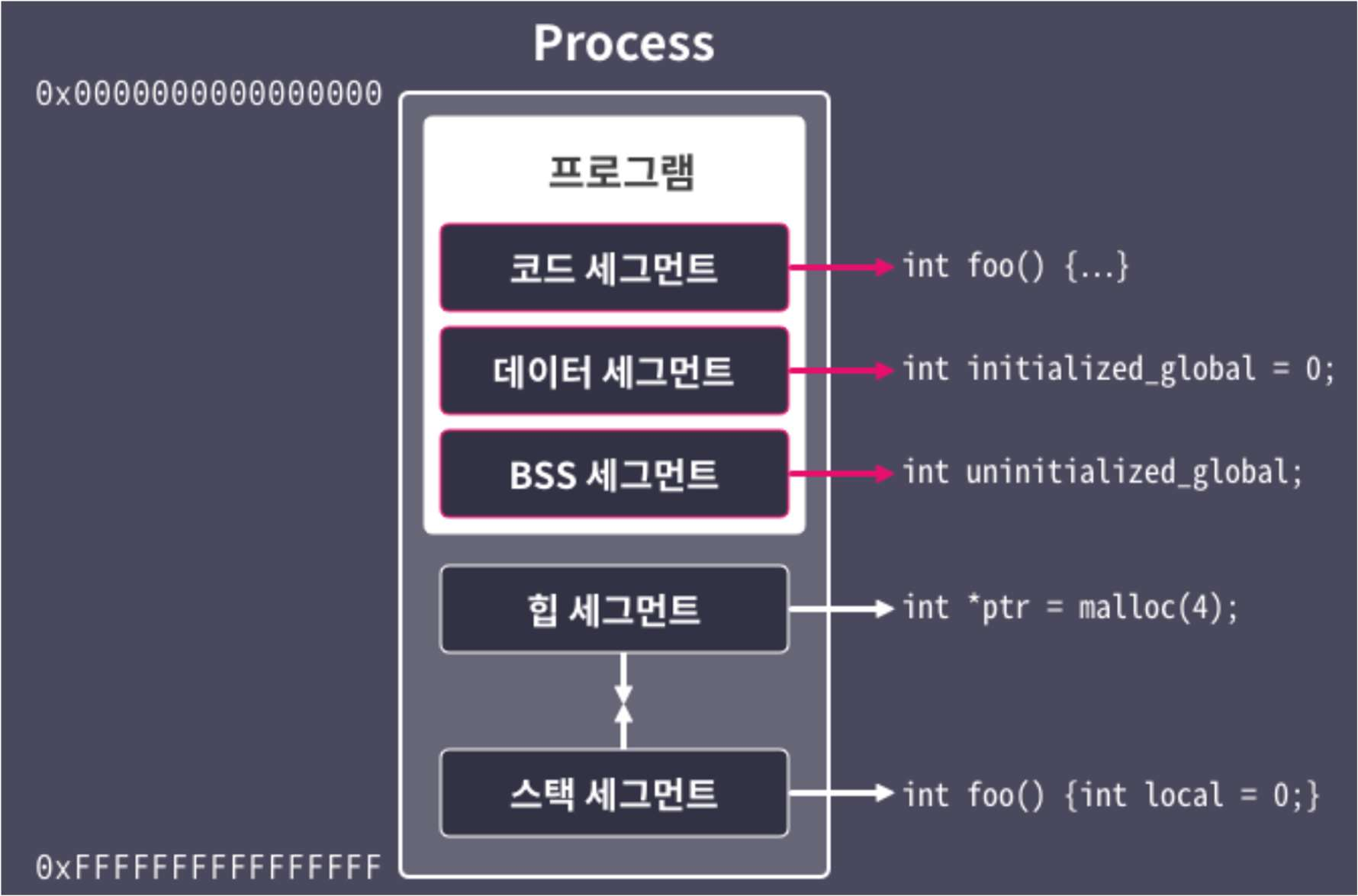 정수를 반환하는 main 함수가 컴파일 되면 기계어로 변환되는데, 이 기계어가 코드 세그먼트에 위치한다.