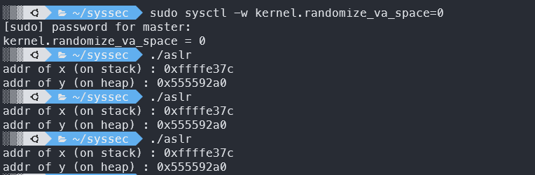 sysctl 명령어를 사용하여 주소 랜덤화를 꺼준다.